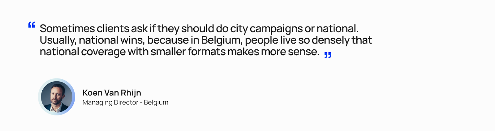 "Sometimes clients ask if they should do city campaigns or national. Usually, national wins, because in Belgium, people live so densely that national coverage with smaller formats makes more sense."
