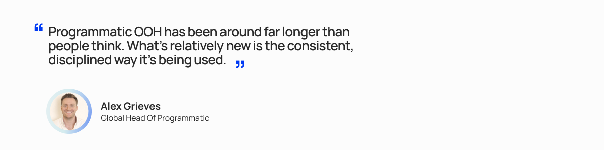 “Programmatic OOH has been around far longer than people think. What’s relatively new is the consistent, disciplined way it’s being used.” said Alex Grieves, Global Head of Programmatic at billups.