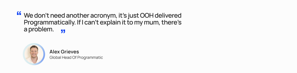 “We don’t need another acronym,” Grieves said. “It’s just OOH delivered Programmatically. If I can’t explain it to my mum, there’s a problem.”